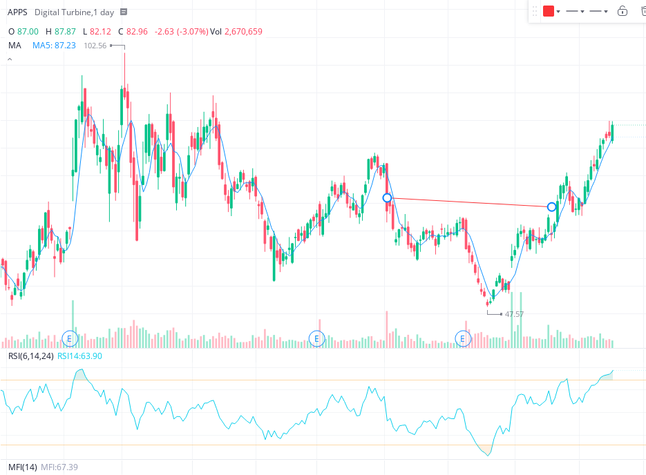 반대로 디지털 터빈은 매수점을 잘못 잡은 주식입니다. 개인적으로 디지털 터빈에 대해서 좋게 생각하고 있었으며, 차트상 표시된 RSI 50 지점에서 매수를 하였습니다.(고평가 지점 매수) 그 후, 매드머니의 짐 크래이머 등의 유명인의 매도 발언, 고평가 논란으로 폭락하게 되었습니다.