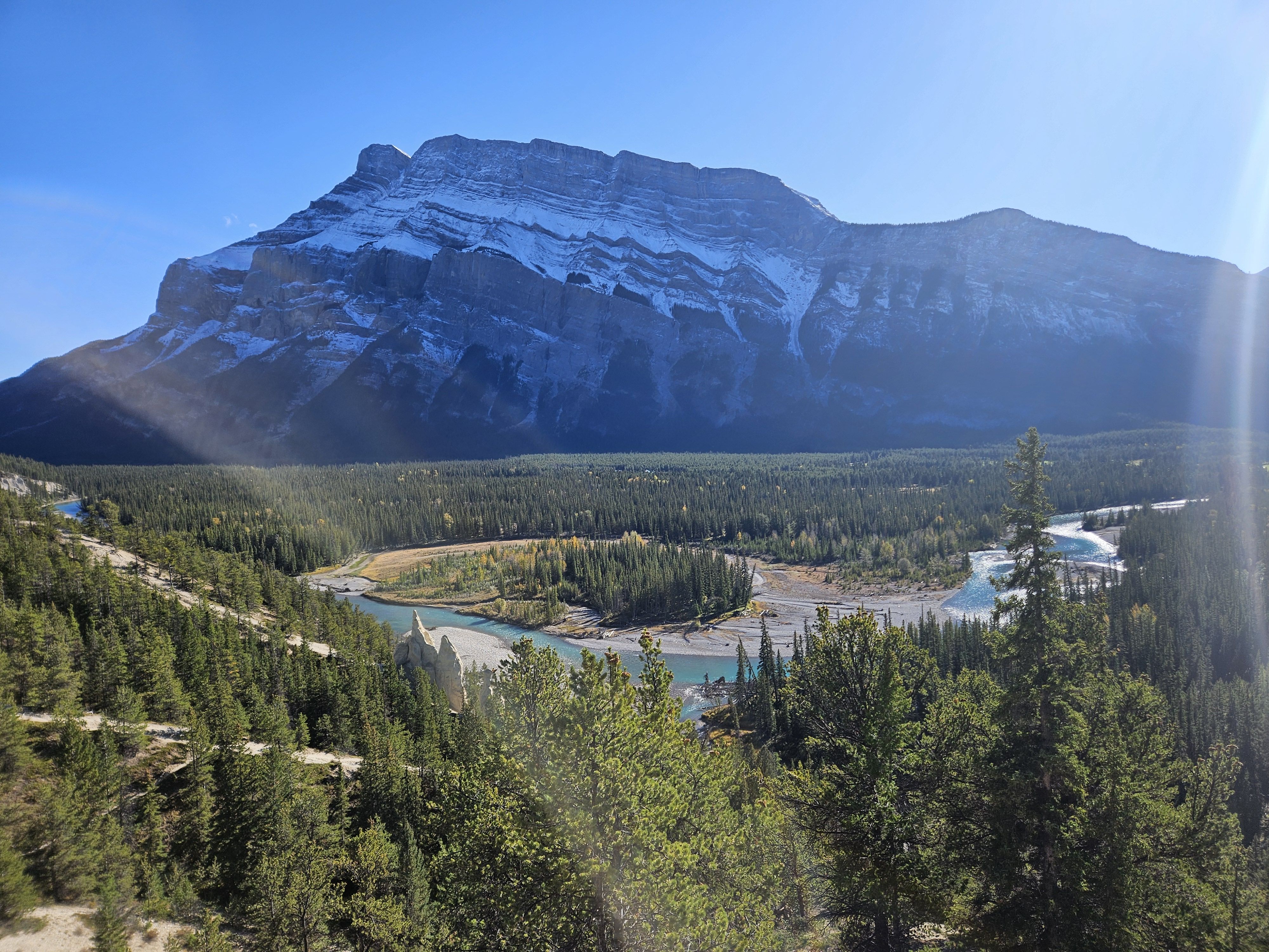 모레인 호수는 로키산맥에 숨겨져 있다 보니 겨울철에는 입장이 제한됩니다. 저는 10월 초에 오다 보니 아름다운 설산과 호수의 전경을 볼 수 있었습니다. 댐(?)을 지으려고 돌을 쌓아둔 곳이 있는데 여기서 사진을 찍으면 위에서 아래를 찍을 수 있어서 사진이 잘 나오더라고요.